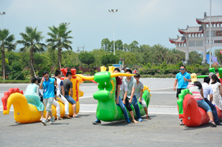 旱龙舟是在陆地上进行的模拟龙船比赛的活动。参与旱龙舟比赛的游客均可获得饮料一袋,在120秒内完成60米旱龙舟比赛的游客还可获得中国现代农业技术展示馆的体验券一张,免费进馆参观游览。火辣辣的太阳也抵挡不了游客参与旱地划龙舟大赛的激情。活动一开始就得到了游客的积极响应,大家纷纷组队参与到活动中来。参赛队员你追我赶,紧张刺激的比赛引得现场围观的游客不停地加油呐喊助威。