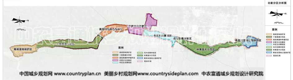功能结构:依托引黄入冀补淀引水渠,统筹考虑用地空间特色,尊重原有生态格局,承接现状旅游文化资源、融合产业发展基础,规划打造“一带、八区、七星”功能结构,以此形成规划的主要构架,依托构架,再进行示范带的发展规划。一带:中央生态景观带。由引黄入冀补淀引水渠及两侧各50-70米的经济林和莲塘组成,结合沿渠慢行道路系统,形成贯穿南北两段各个片区的中央生态景观带。八区:大产业片区。南湖湿地保护区、十里莲塘示范区、高效果蔬种养循环区、农旅文化创意区、市区生态景观区、创意花卉体验区、林果苗木示范区、青龙淀湿地休闲度假区。七星:七个主题小镇。依托产业发展,融合旅游资源,打造南湖小镇(南湖村)、汤泉小镇(郎寨村)、农耕人家(张庄村)、莲湖小镇(马辛庄村)、桑梓人家(班家村)、大秦小镇(杨庄窑村)、卫河码头(苏堤村)等7个主题小镇。