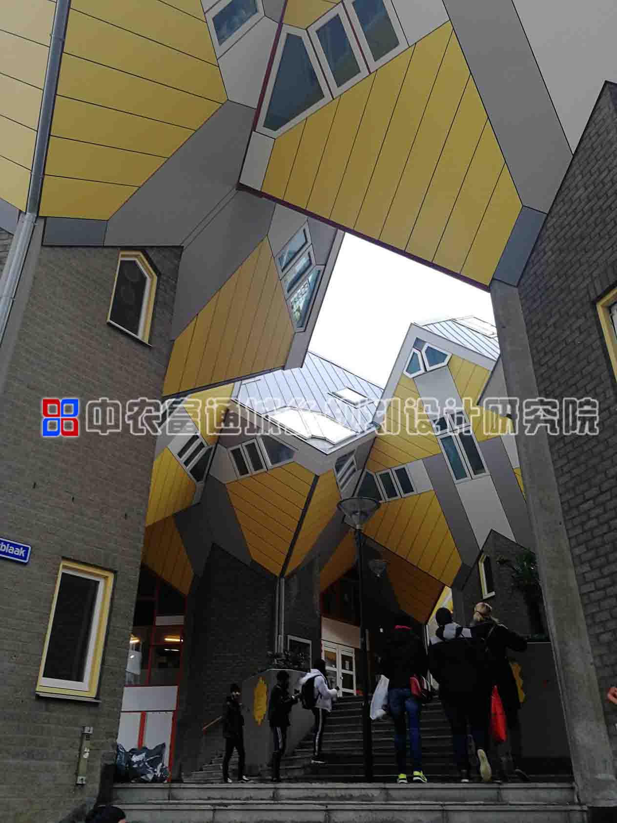 荷兰建筑师Piet Blom创造这个有趣的建筑的初衷是为城市增添一点生气和活力。他把这个住宅抽象为树的形态,使扭转了45度的正方体“生长”在六边形的“树干”上,其中三个面朝向地面,另外三个面朝向天空。使立方体处于一种不稳定的状态,打破了人们对立方体的视觉惯性,从而产生一种动感,具有强烈的视觉效果。由于荷兰的海拔高度比较低,海水不时会漫上地面,因此荷兰建筑一般都会架高半层或一层,底层空间用作仓储,从二层起才是客厅。方块屋由四层空间组成,各层楼板依旧保持着与地面平行,墙面则不再垂直于楼板,而是向外倾斜。