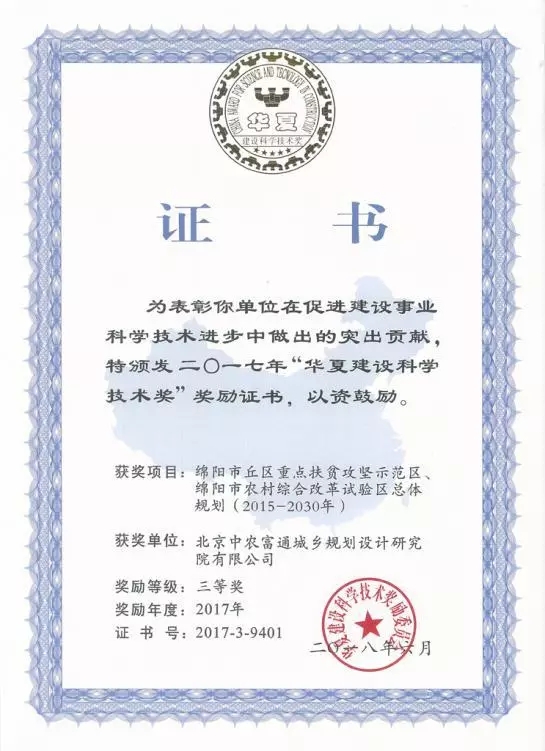 2017年华夏建设科学技术奖经评审委员会评审、公示等程序,由华夏建设科学技术奖励委员会华夏奖字〔2018〕第11号《关于发布“2017年度华夏建设科学技术奖”授奖项目的公告》进行了公布。我院《绵阳市丘区重点扶贫攻坚示范区、绵阳市农村综合改革试验区总体规划(2015—2030年)》项目荣获“2017年度华夏建设科学技术奖”三等奖。
