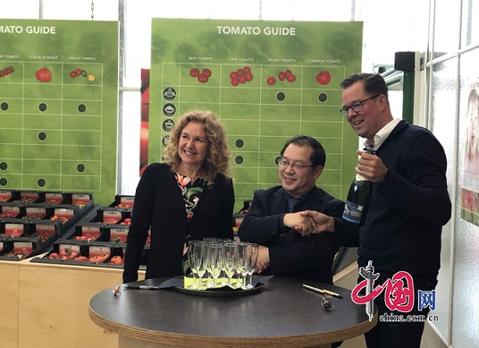 番茄大世界常务董事米兰达·范登恩德女士(Miranda van den Ende)、番茄大世界董事会成员兼Greenco企业董事乔斯·范米尔先生(Jos van Mil)和张天柱先生在仪式上成功签署了该协议。(袁奎)