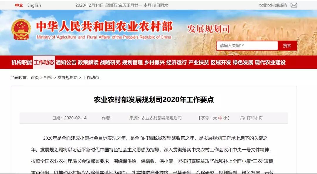 农业农村部发展规划司2020年工作要点