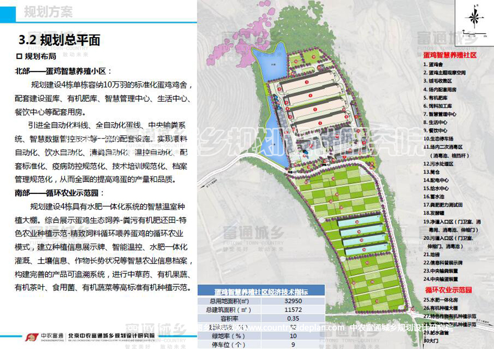 蛋鸡智慧养殖社区与循环农业示范园两区共建,资源互补,互为支撑发展,打造集蛋鸡养殖、蛋鸡主题观摩、粪污综合处理、有机肥生产、循环农业种植示范为一体的: 现代农业生态循环示范区、蛋鸡养殖创新发展示范点(中农富通城乡规划设计研究院规划设计案例)。