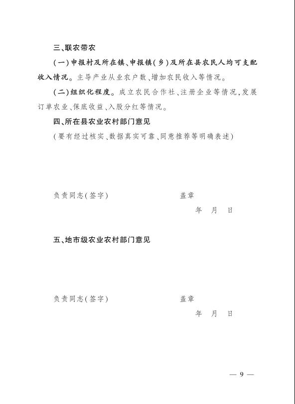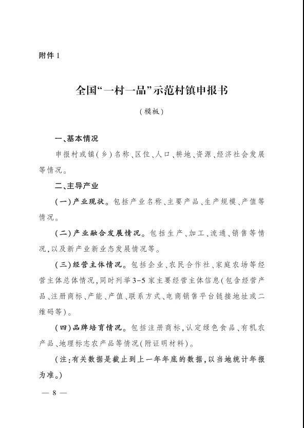 第九条 县级农业农村部门组织符合条件的村(镇)自愿申报,填写纸质《全国“一村一品”示范村镇申报书》(见附件1),并登录申报监测线上平台在线填报有关信息。